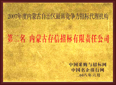 • 2008年度內(nèi)蒙古自治區(qū)最具競爭力招標(biāo)代理機構(gòu)第一名